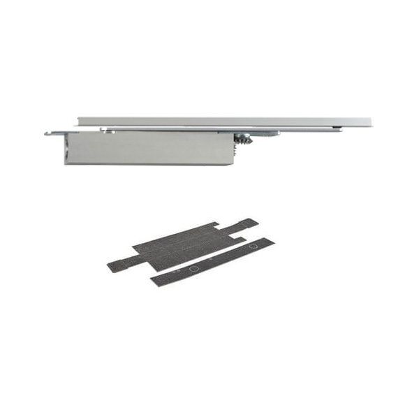 An integrated concealed door closer that fits discreetly into the top of the door, with the guide rail fitting into the frame.