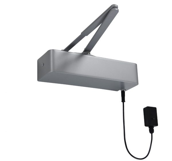 This electromagnetic door closer is universal, it can be fitted on push, pull, left or right side, in hold-open or swing-free mode.